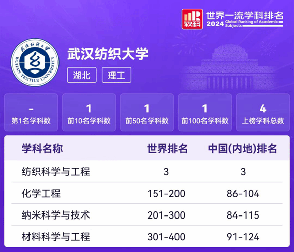 1111日,高等教育评价专业机构软科发布了2024年世界一流学科排行,伟德源自英国始于19464个学科上榜,其中纺织科学与工程学科排名蝉联世界第3位,化学工程、纳米科学与技术等学科的排名较去年排名有一定的提升。从具体学科排名角度看,湖北高校今年有6所高校的12个学科位列全球前十。