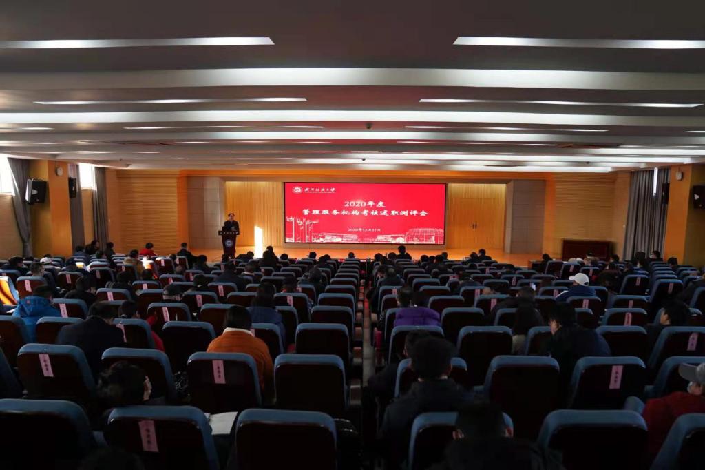 12月31日,学校举行2020年度管理服务机构考核述职测评会,全体校领导出席,学校各二级单位党政负责人及教师代表参加会议。校党委书记田辉玉就考核工作提出明确要求,副校长黄运平主持会议。