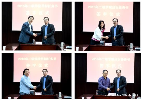 报告会结束后,纺织学院、数计学院、服装学院、管理学院作为二级学院代表,分别与学校签订了2016年目标管理任务书。韦一良要求与会同志深刻领会和把握别敦荣教授报告的精髓,带领本单位干部师生积极参与学校“十三五”规划和各专项规划的编制工作,特别是修改、完善学院“十三五”发展规划。2016年是“十三五”开局之年,发展规划重在落实,各二级单位领导班子要理清发展思路、明确发展任务,按照省委对党员干部履职尽责的要求,把人才培养、科学研究、社会服务的职能项目化、清单化,责任到人,勇于担当,努力开创学校事业发展新局面。